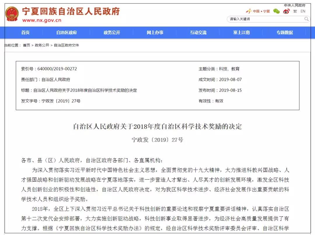 永利yl23411集团参与的项目荣获“2018宁夏科学技术重大贡献奖”
