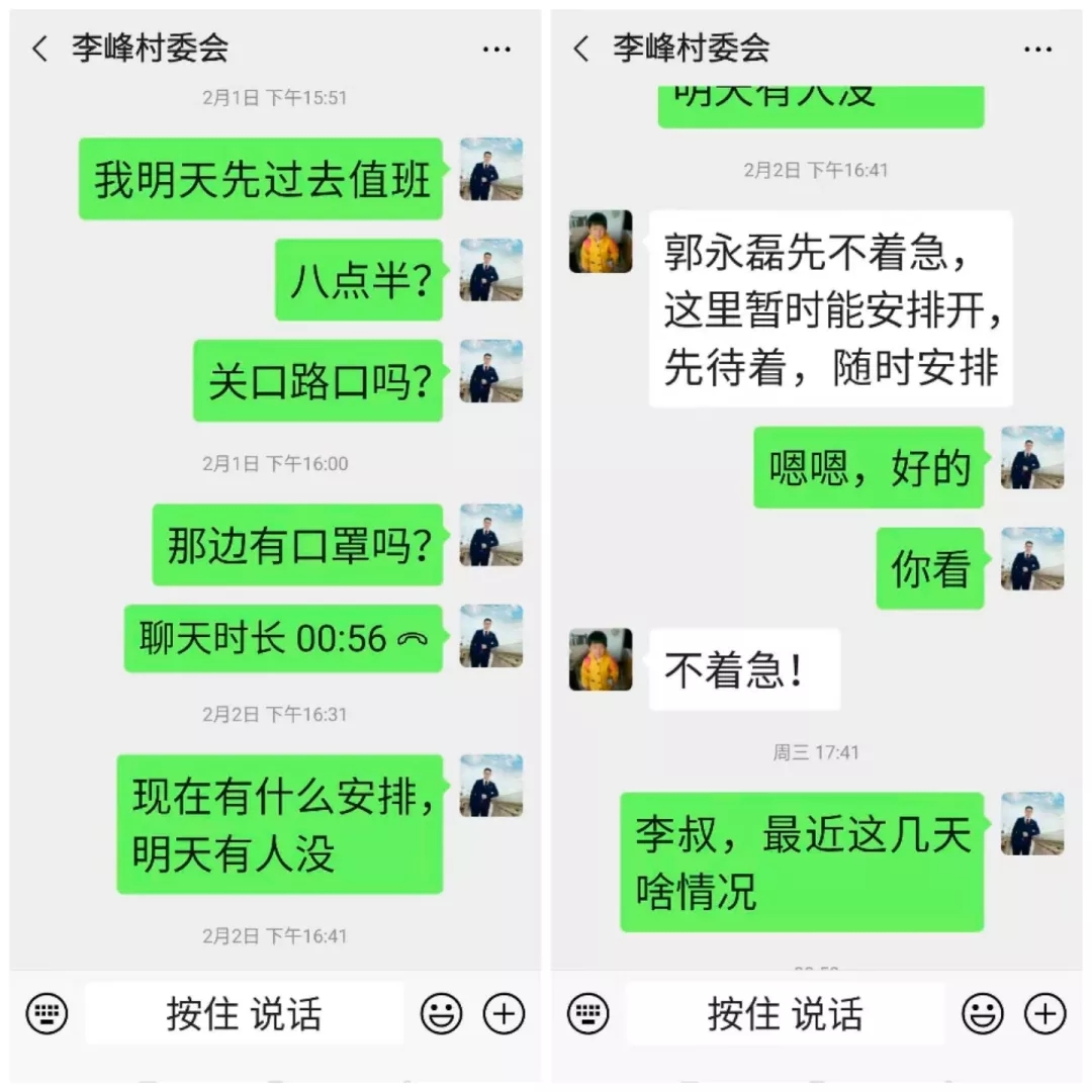 后续几天,他一直与村领导微信保持联系,2月7日早上村领导打电话给他说,需要人手对村民家进行疫情摸底排查,人手不够,需要大学生党员支援,他毫无迟疑的答应,“一切听从领导安排。”顺利到岗,配合村领导高效率的完成任务!