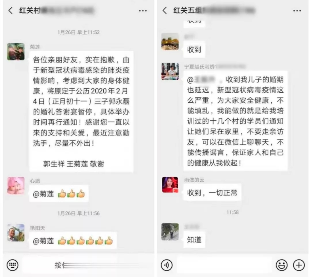 “由于最近武汉疫情形势非常严峻,并且传播的速度特别快,为了降低婚礼聚集引发风险,需要暂时取消郭永磊的婚礼活动。”
