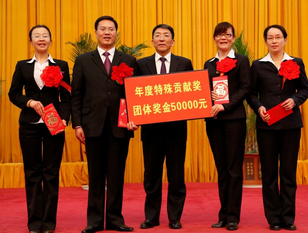 公司董事长郝向峰先生(中)为特殊贡献者颁发团队奖并合影留念