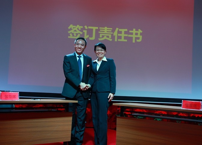 总经理郝晓琴女士与销售总监张国旺签署销售任务目标责任状后握手庆贺