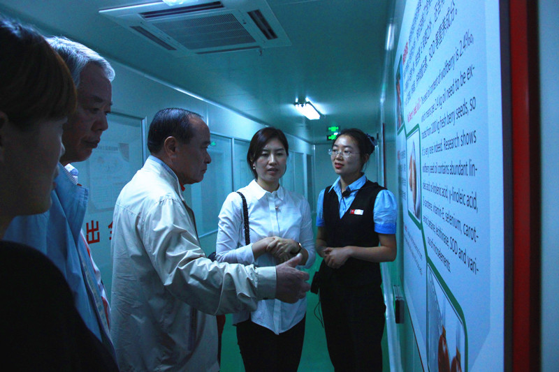21C韩中交流协会会长金汉圭先生(中)了解枸杞油胶丸的生产工艺