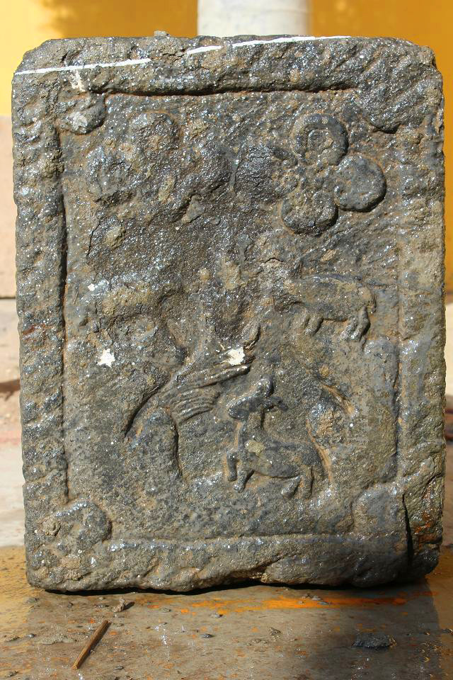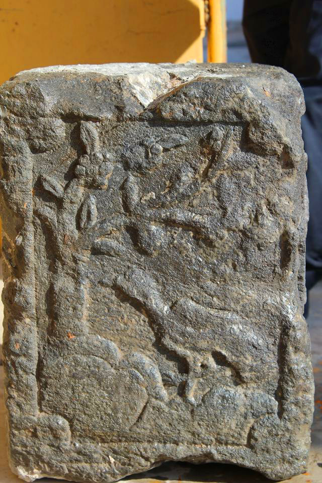 此块角柱石浮雕高0.8米,宽0.5米。一面是杞鹤延年图,一面是杞鹿(齐禄)同寿图,意即六合(鹿鹤)同天,国泰民安;侧面是三羊开泰。浮雕的两正面,是鹿鹤衔枸杞枝的图案,枝上有果柄痕,在两片枸杞叶的衬托下,显露出纺锤形的枸杞果。在枸杞的主产区,清水河与黄河的交接口能发现这样一民间吉祥物,可以说天赐祥瑞。