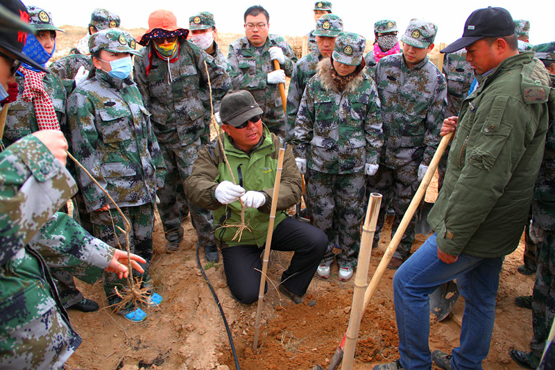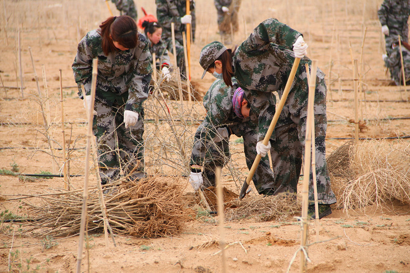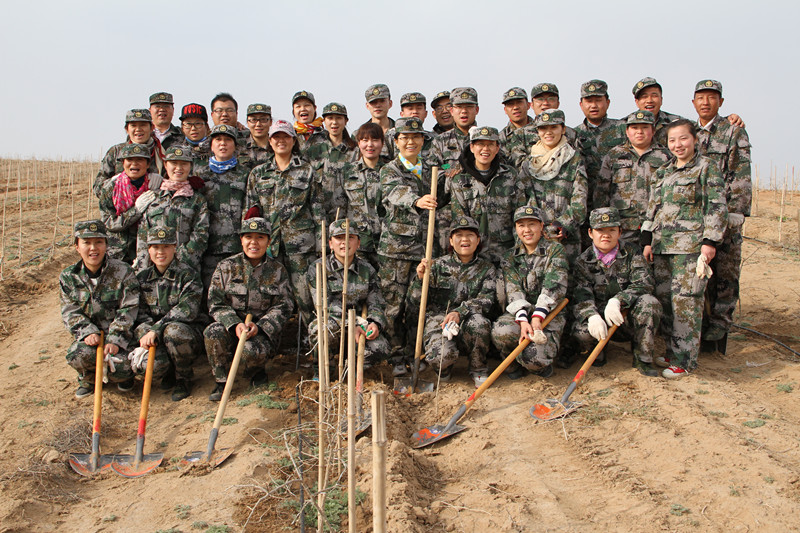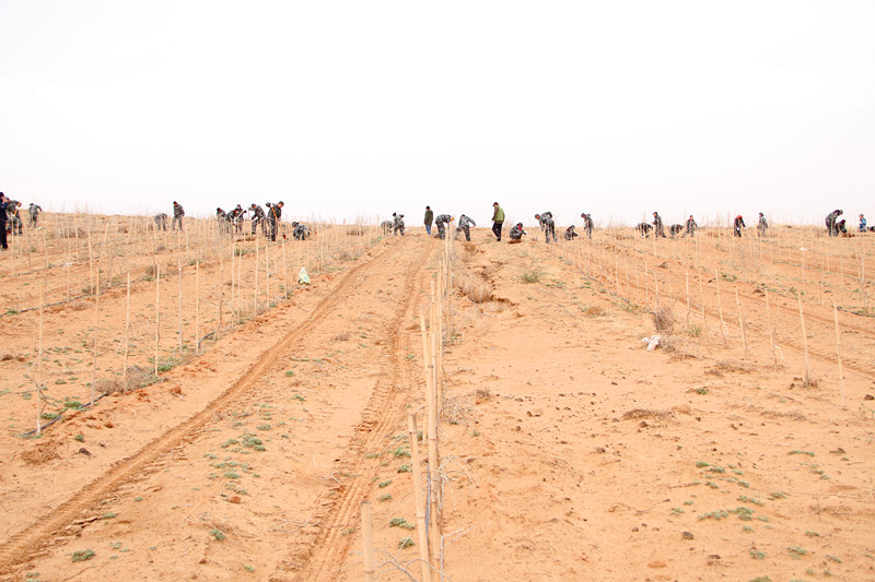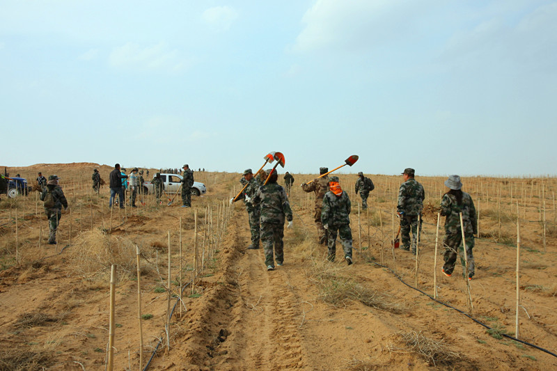 4月7日、8日两天时间,在公司总经理郝晓琴女士的带领下,来自永利yl23411集团7大中心的100多名家人,装着迷彩服,浩浩荡荡的进入大漠腹地深处,开始了为期两天的植树活动。植树活动在基地技术指导专家郝宏伟的指导下,100多名永利yl23411集团家人,领了铁锹,踏着沙土,走进广袤的原生态种植基地,按照技术指导专家的种植步骤:挖坑、放苗、填土、踩实……