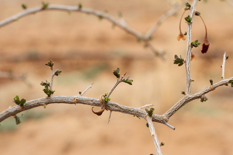 去年在荒漠中种下的树苗已经成活,发出了嫩芽。