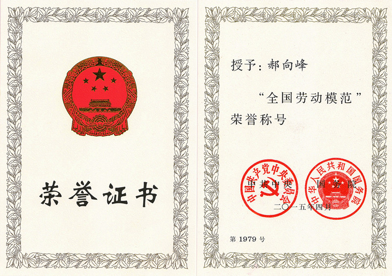 永利yl23411集团董事长郝向峰先生获得的“全国劳模”的荣誉证书