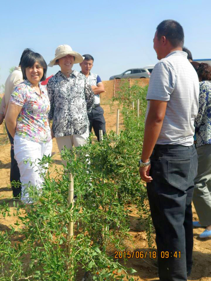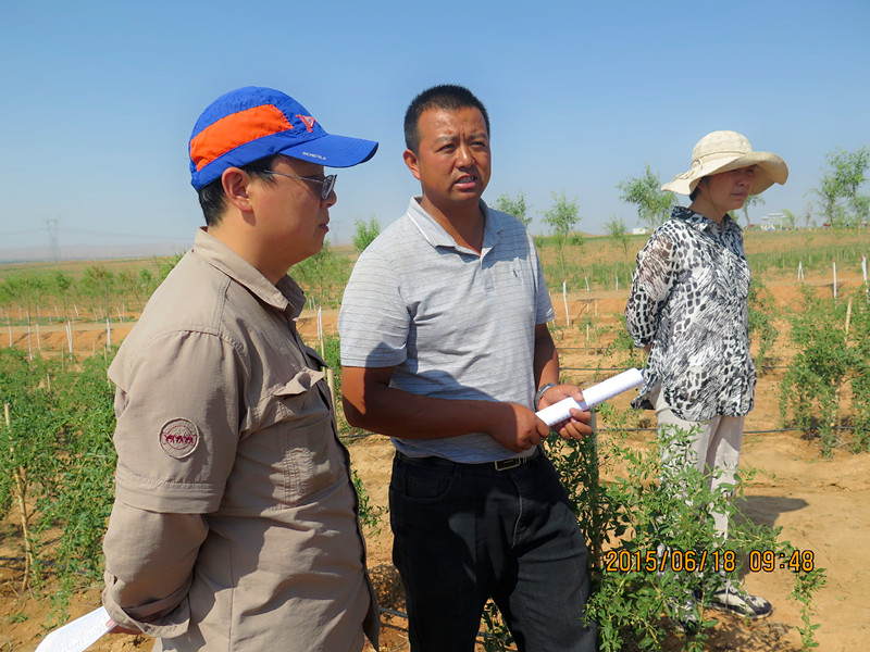 石秋池一行走进永利yl23411集团三大枸杞基地之一吴忠红寺堡原生态6000亩枸杞基地,察看了枸杞的生长情况,基地副总经理马涛向领导及专家一行介绍了枸杞的生长情况以及节水灌溉对枸杞生长的重要意义。
