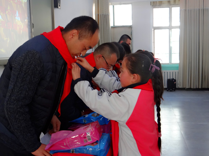同学们为爱心人士带上红领巾
