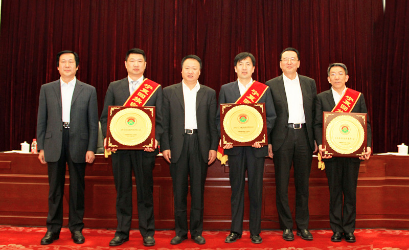 颁奖仪式上,自治区副主席王和山(左三)等领导与获奖企业领导合影。