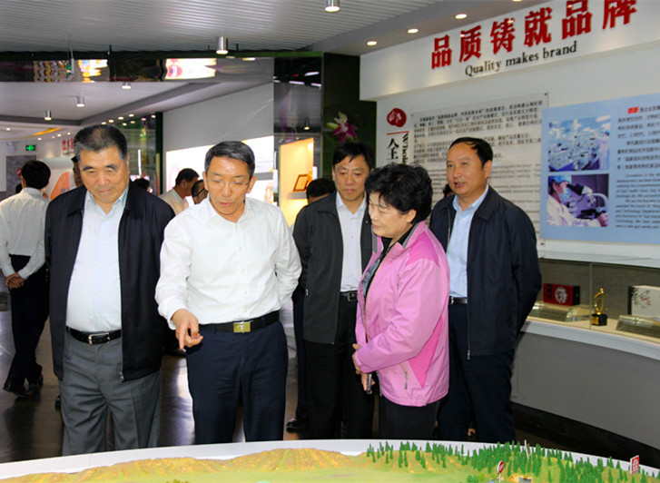 董事长郝向峰先生(中)向李成玉省长(左一)、张维宁副省长(后右二)和自治区政协副主席张乐琴(右一)等领导介绍永利yl23411集团产业链布局