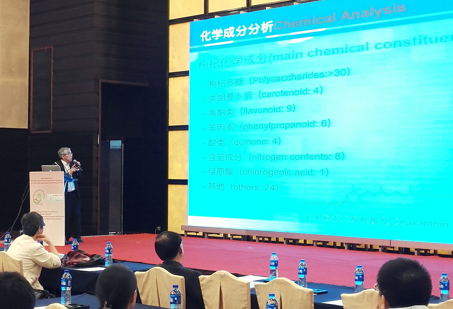 苏国辉院士从枸杞的基本情况、化学成分、生物学保健功能,尤其是枸杞对眼部保护作用、壮阳作用和治疗老年痴呆症,以及枸杞的未来研究方向和发展方向做了详细的讲解。
