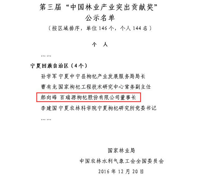 2016年12月23日,由国家林业局召开的第三届全国林业产业大会在北京隆重召开,会议上对我国林业产业发展做出突出贡献的单位及个人进行了表彰,永利yl23411集团董事长郝向峰先生荣获第三届“中国林业产业突出贡献奖”,这也是宁夏枸杞行业中唯一获此殊荣的企业家。