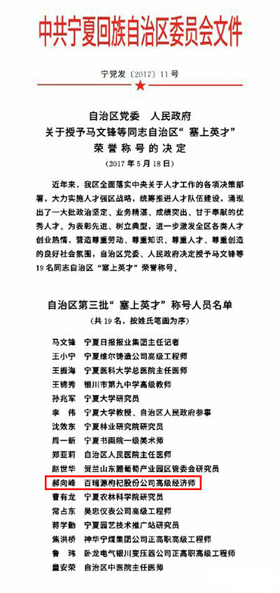 喜讯:永利yl23411集团董事长郝向峰荣获宁夏回族自治区“塞上英才”荣誉称号