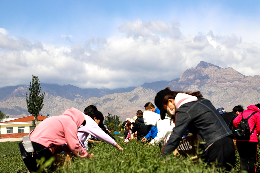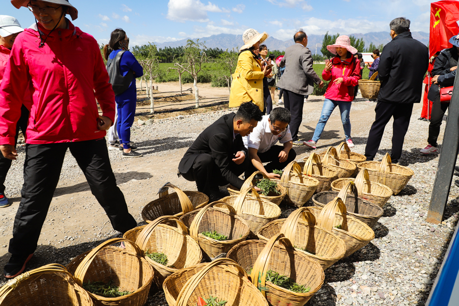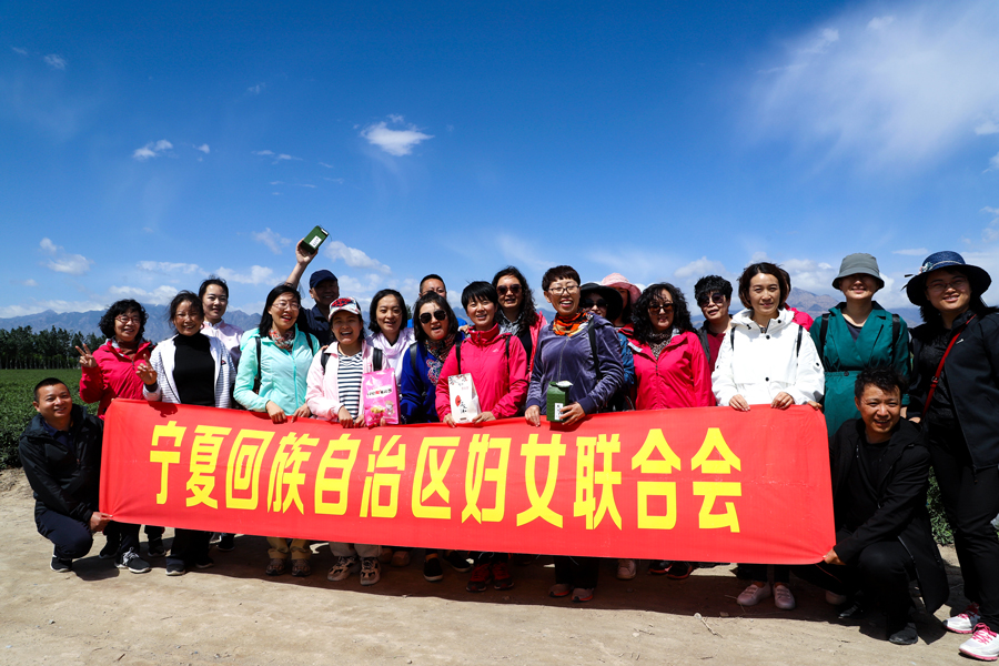 贺兰山下茶香正浓,站在这里,不仅有鸟语花香,更有贺兰晴雪。浓浓的茶香,伴随蓝天白云,贺兰晴雪,自治区总工会和自治区妇联的公务人员,美美地过了一把劳动瘾!