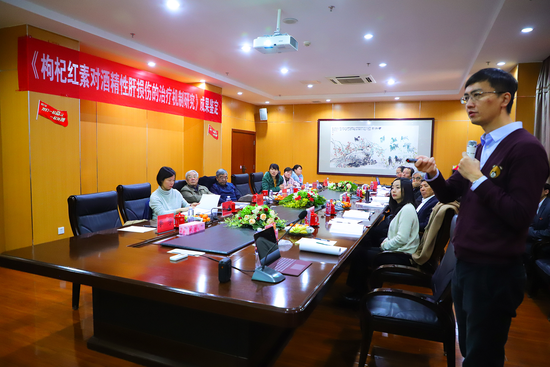 ▲ 项目负责人向各位专家进行汇报 永利yl23411集团技术负责人张金宏表示,尽管枸杞子的食用和药用历史悠久,在“清肝、明目、补肾、益气”上有着广泛的应用。但有关其有效成分的分离鉴定、疾病治疗的分子机制、临床治疗效果和安全性的研究直到最近20年才慢慢受到重视。《枸杞红素对酒精性肝损伤的治疗机制研究》对宁夏枸杞产业发展带来新的产能,引领产业迈向更深的加工领域。