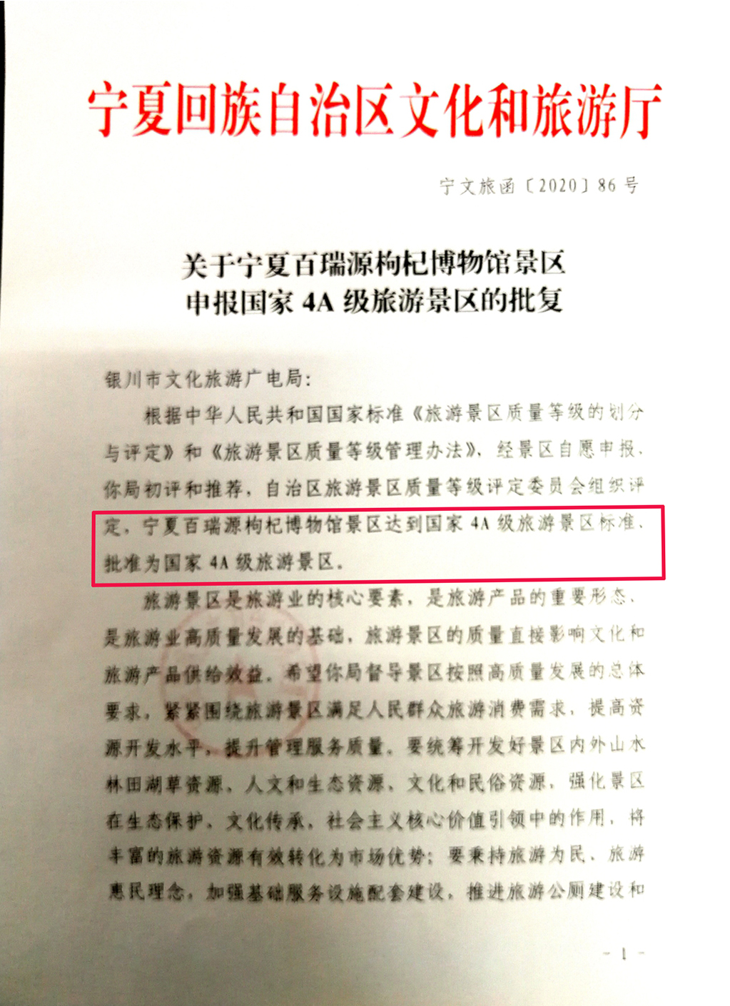根据中华人民共和国国家标准《旅游景区质量等级的划分与评定》和《旅游景区质量等级管理办法》,经旅游景区自愿申报、设区的市级文化旅游行政部门推荐,自治区旅游景区质量等级评定委员会按程序组织综合评定,宁夏永利yl23411集团枸杞博物馆旅游景区达到国家4A级旅游景区标准要求,确定为国家4A级旅游景区。
